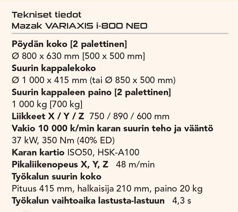 Toinen tänä vuonna mittavan päivityspaketin saanut Mazak-koneistuskeskus on viisiakselinen kehtopöytäkone VARIAXIS i-800 NEO. Tätä kokoluokkaa on valmistettu vaativille asiakkaille Japanissa jo yli 1 200 kappaletta. Markkinoiden toiveista on konetta kehitetty niin että sen automatisointi on nyt mahdollisimman helppoa ja tehokasta. Samoin koneistuksen nopeutta ja tehokkuutta on parannettu huomattavasti vastaamaan nykyaikaisen tuotannon koviin vaatimuksiin. Edelliseen malliin verrattuna esimerkiksi pikaliikenopeus on parantunut ja työkalujen vaihtoaika lyhentynyt.