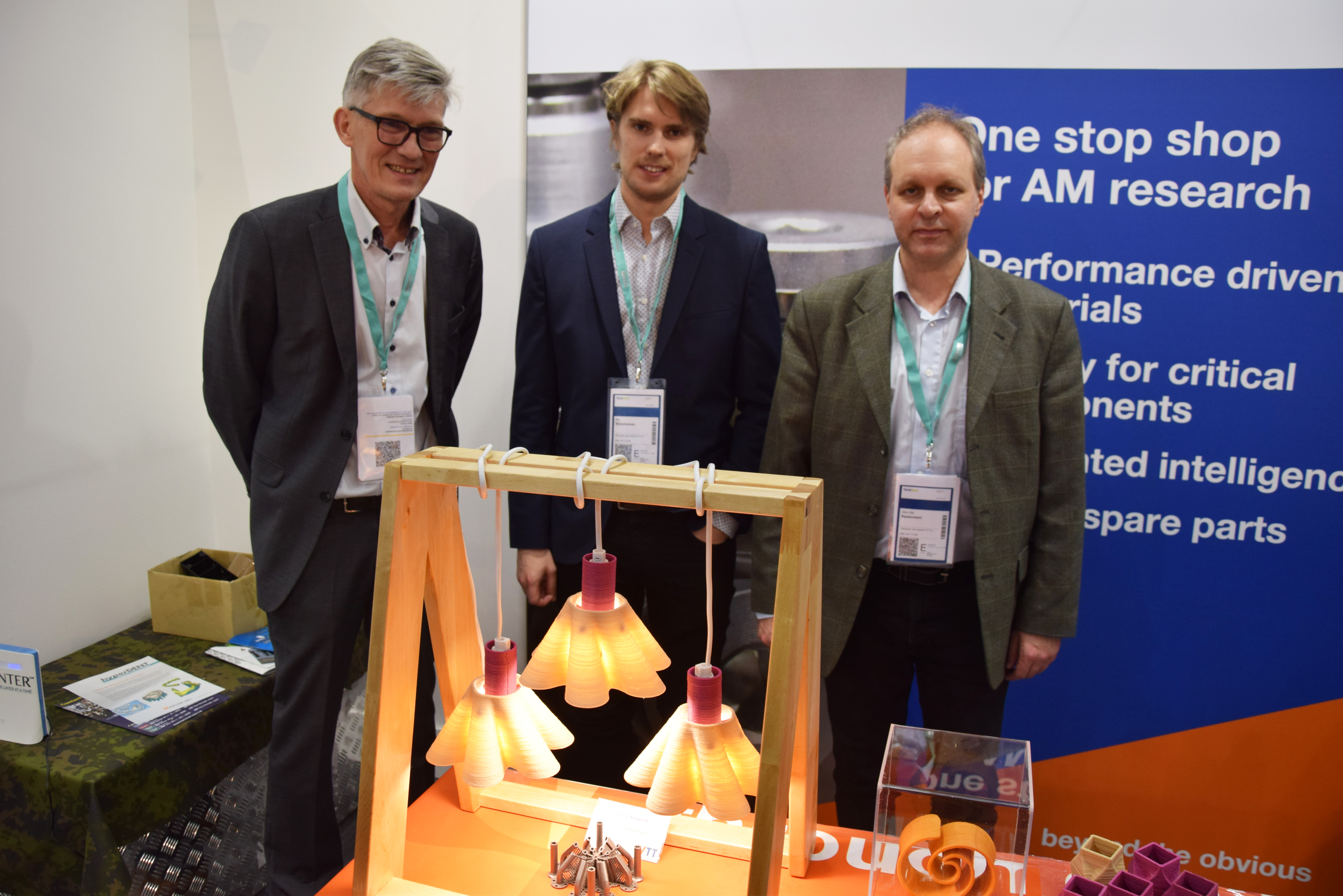VTT oli messuilla markkinoimassa asiantuntemustaan eri materiaalien 3D-tulostukseen liittyvissä toiminnoissa ja tutkimuksessa. Miehet vasemmalta Tuomas Pinomaa, Mio Silvennoinen ja Otto Ville Kaukoniemi, pöydällä tulostetut kappale-esimerkit metallista sekä yhdeltä erikoisalueelta eli selluloosamateriaalin hyödyntämisestä 3D-tulostuksen tarpeisiin.