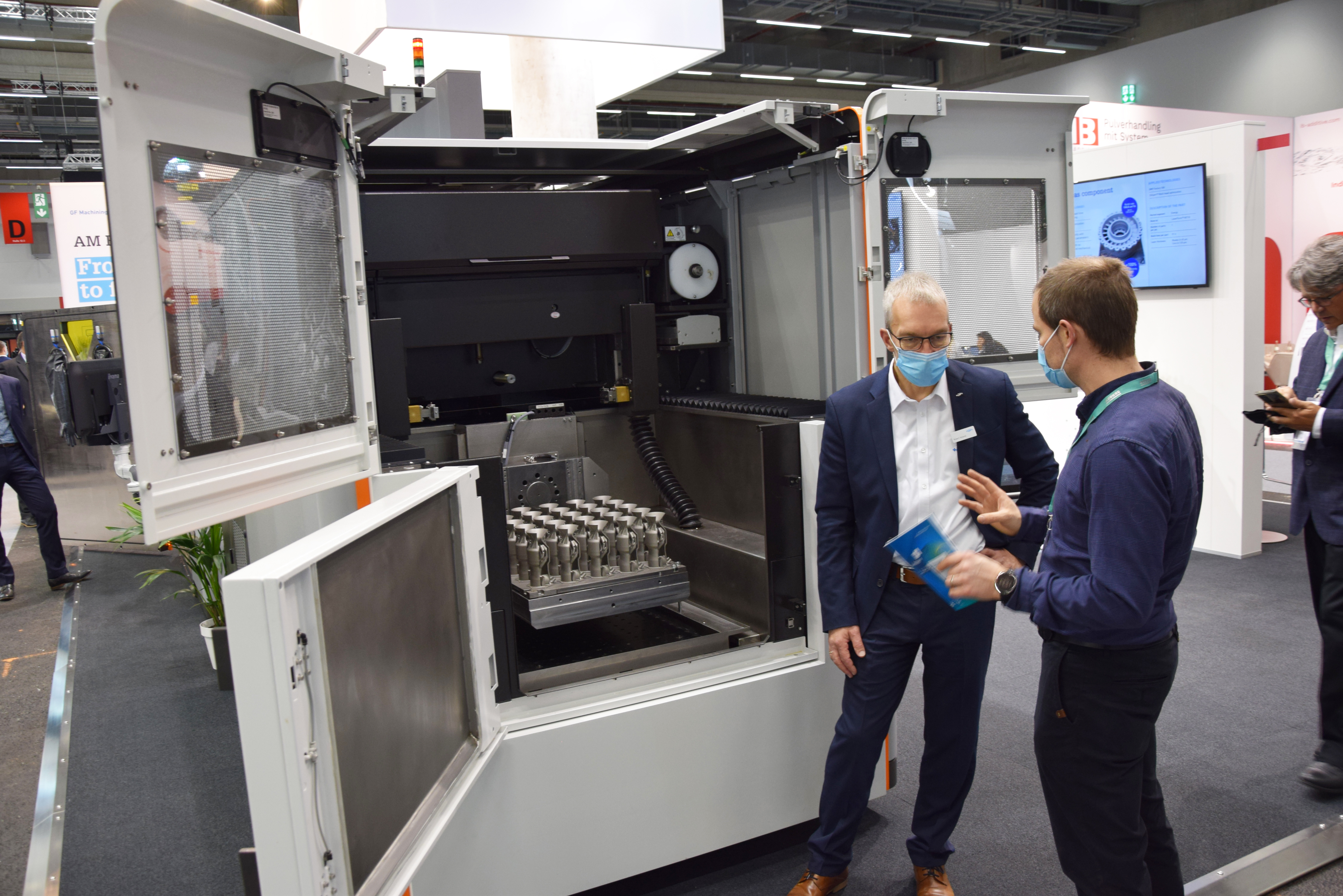 GF:n Cut AM 500 messuesittelyssä. Isolla työalueella varustettu nopea kone erottaa EDM-teknologian avulla jauhepetimenetelmällä tulostetut kappaleet sujuvasti kasvatusalustasta. Maksimimitat kappaleelle/ryhmälle on 510x510x490 mm ja -paino 500 kg.