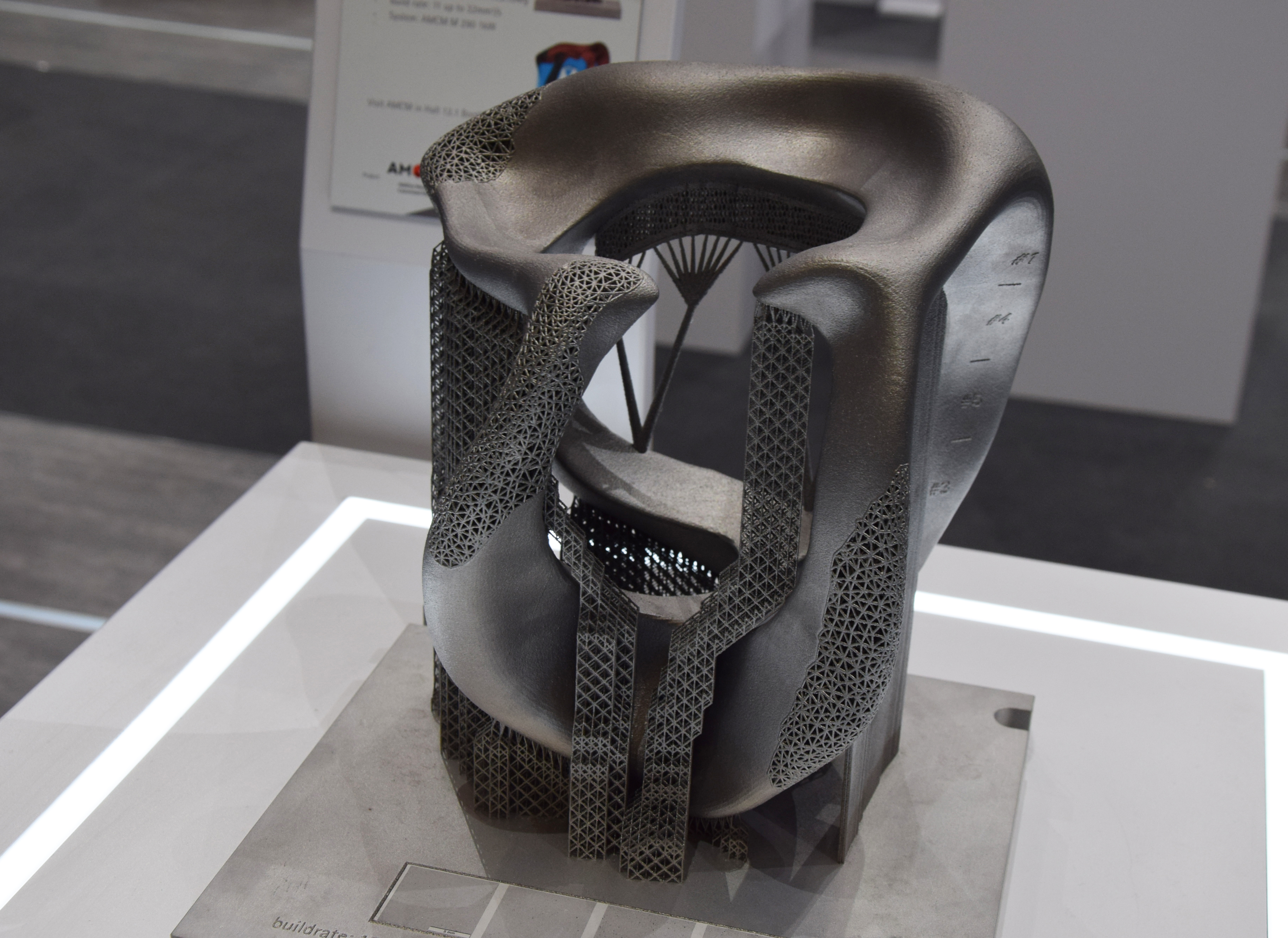 Alan pioneereihin kuuluvan EOS:in osaston painopiste oli tällä kertaa vahvasti tuote-esimerkkien puolella, ja toki asiantuntemuksen. Kuvassa yksi 3D-tulostuksen mahdollisuuksia havainnollistava AMCM:n muototutkielma, materiaali EOS-alumiini AISi 10 Mg, tulostusnopeus valmistajan M290-mallilla 11-32 mm3/s.