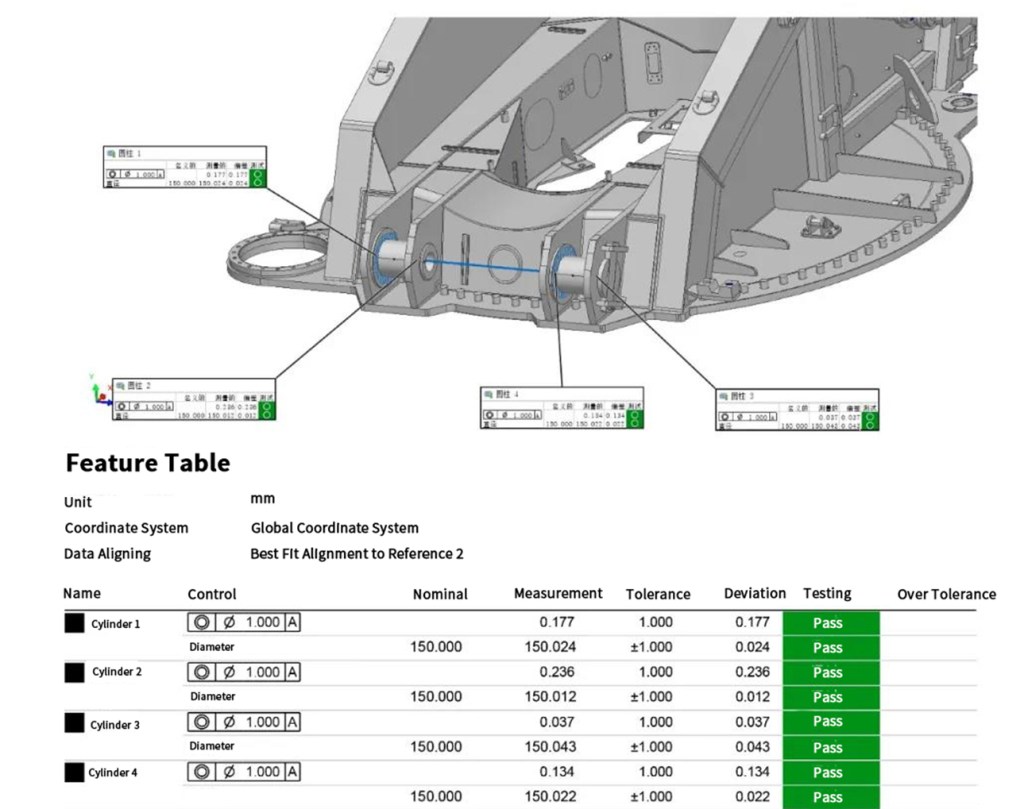 Tässä tapauksessa koko koneen painon kantamiseen välttämätön alusta on yleensä yli kolme metriä pitkä ja rakenteeltaan monimutkainen. Osan hankalat alueet ja tehottomat menetelmät muodostavat haastavan tehtävän saada kiinnitysreikien tarkat muodon, muodon ja sijainnin toleranssit.