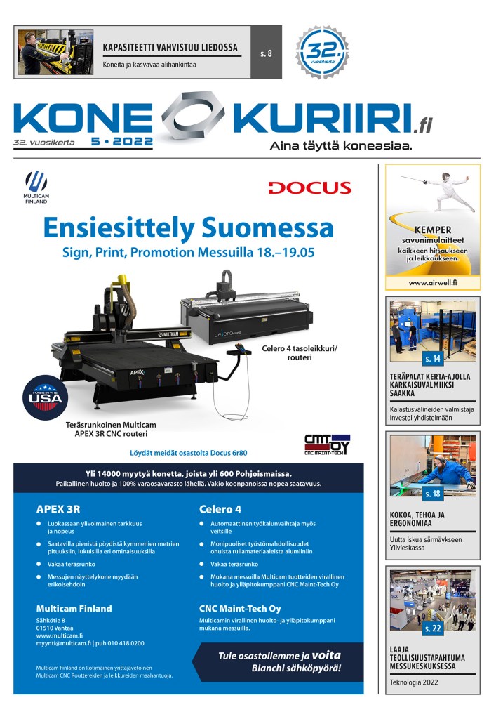Konekuriirin toukokuun numero 5/2022 on ilmestynyt. Metallin konemarkkinoiden ajankohtaispaketti, kiintoisimmat koneet ja laitteet sekä tuoreet uutiset. Uutta teknologiaa, innovaatioita ja tapahtumia. Investointiartikkeleja tällä kertaa mm. Liedosta, Korpilahdelta, Ylivieskasta. Messukatsaus Helsingistä.