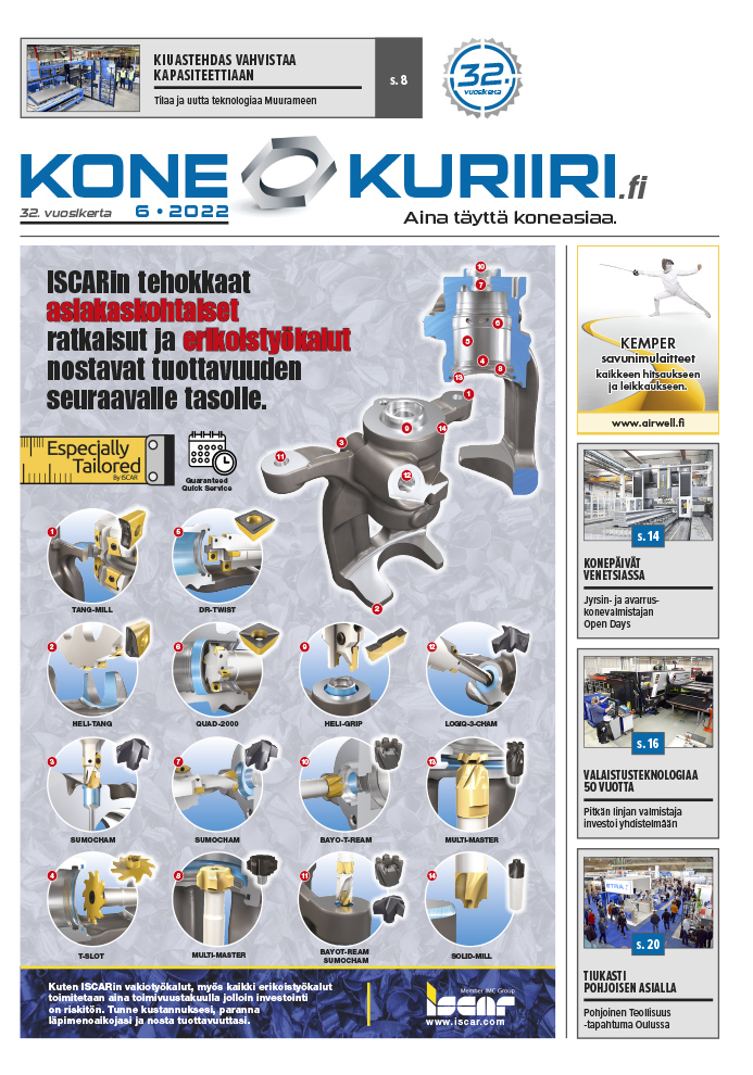 Konekuriirin kesäkuun-elokuun numero 6/2022 on ilmestynyt. Metallin konemarkkinoiden kiinnostavimmat koneet ja laitteet sekä tuoreet uutiset. Kesänumerossa on mukana uutta teknologiaa, konetapahtumia- ja näyttelyjä, messukatsaus pohjoisesta ja investointiartikkeleja mm. Muuramesta ja Lahdesta.