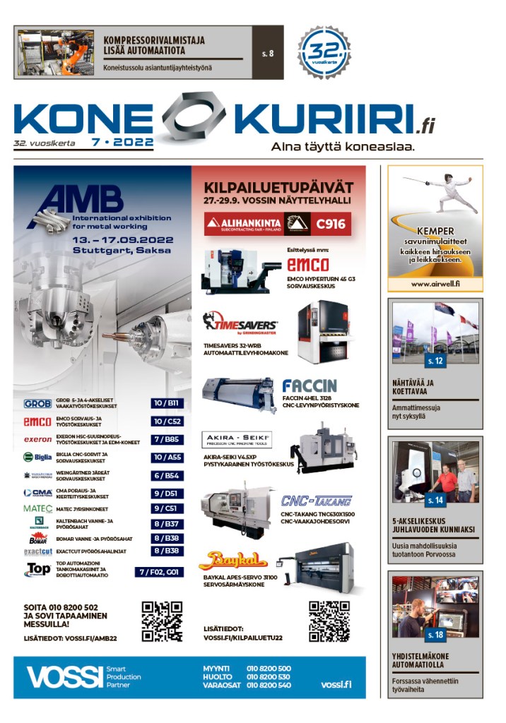 Syyskauden avaus! Konekuriirin syyskuun numero 7/2022 on ilmestynyt. Syksyn ensimmäisessä numerossa metallin konemarkkinoiden ajankohtaisimmat, kiintoisimmat koneet ja laitteet sekä tuoreet uutiset. Uutta teknologiaa, ajankohtaisuutisia ja ennakkoasiaa tämän syksyn kiitettävän runsaista messutapahtumista. Investointiartikkeleja mm. Tampereelta, Forssasta, Porvoosta ja Oulusta.