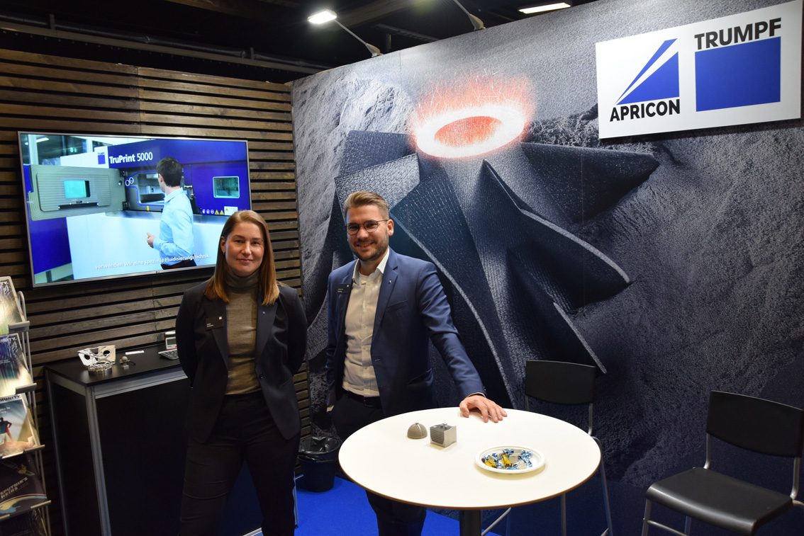 Airwell esitteli osastollaan A-hallissa osastollaan kattavasti valmistamaan ja maahantuomiaan koneita ja laitteita. Yksi kone oli kävijöitä vastassa jo tuloaulassa: hollantilainen viimeistelykonevalmistaja Q-Fin kuuluu Airwellin päämiehiin. Automaattinen viimeistelykonemalli F200 oli esittelyssä.Ohutlevykoneiden valmistajan Trumpfin tuotteita oli esillä TruTekniikan osastolla A-hallissa ja sitten 3D-tulostuksen alueen koneista, jotka kuuluvat niin ikään valmistajan tuotepalettiin oli tietoa tarjolla samalla osastolla B-hallissa. Standilla Heidi Korpiaho ja Johannes Vierling.