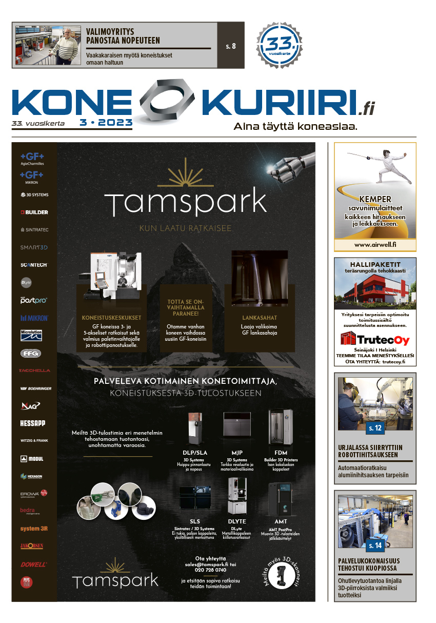 Metallin konemarkkinoiden ajankohtaislehden Konekuriirin numero 3/2023 on ilmestynyt ja koko numero on jälleen täynnä Täyttä Koneasiaa. Uutta teknologiaa, mielenkiintoisia investointi- ja yritysuutisia tiiviissä asiapaketissa. Investointiuutisia maaliskuun numerossa on mukana mm. Tampereelta, Urjalasta, Kuopiosta ja Hollolasta Ja tietysti paljon muuta.