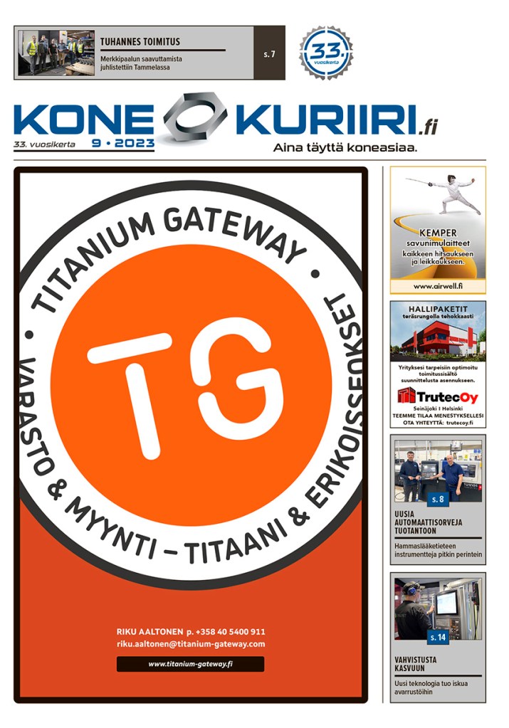 Konekuriirin marraskuun numero 9/2023 on ilmestynyt. Metallin kone- ja laiteuutuuksia EMO-messuilta ja muualta, ajankohtaisia yritysuutisia sekä investointiartikkeleja, tällä kertaa mm. Tammelasta, Paraisilta ja Mustasaaresta. Aina täyttä Koneasiaa – kannattaa lukea.