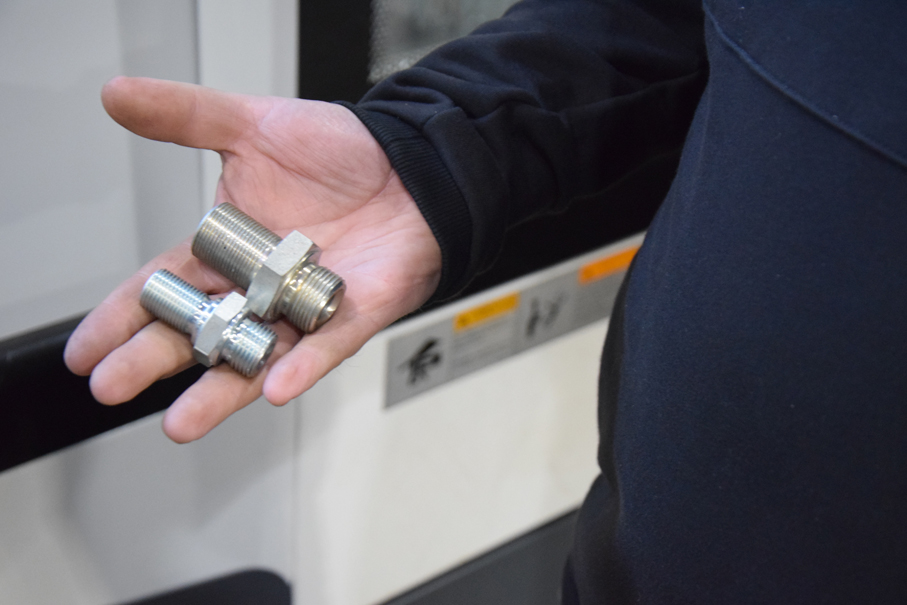 ”Valmistamme koneella mm. hydrauliikkaliittimiä, joihin sorvataan erityyppiset kierteet samanaikaisesti kappaleen kummallekin puolelle. Siinä rakenteen edut pääsevät oikeuksiinsa”, Petri Vehviläinen sanoo.