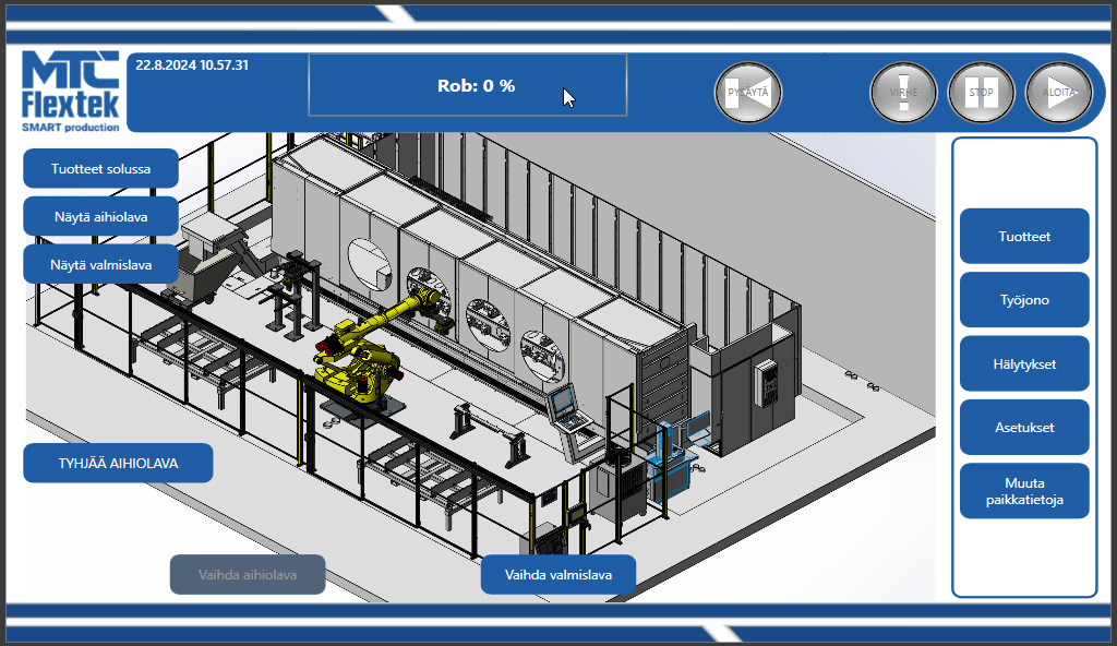 Koko järjestelmä on PLC-ohjattu ja yksikön hallinta tapahtuu HMI-käyttöliittymästä, missä tehdään tuotteiden tuote- ja lavauksenhallinta. Erilaisista valmistettavista kappaleista tehdään työjono ja tuotannon edistymistä sekä järjestelmän tilaa voidaan seurata reaaliaikaisesti.