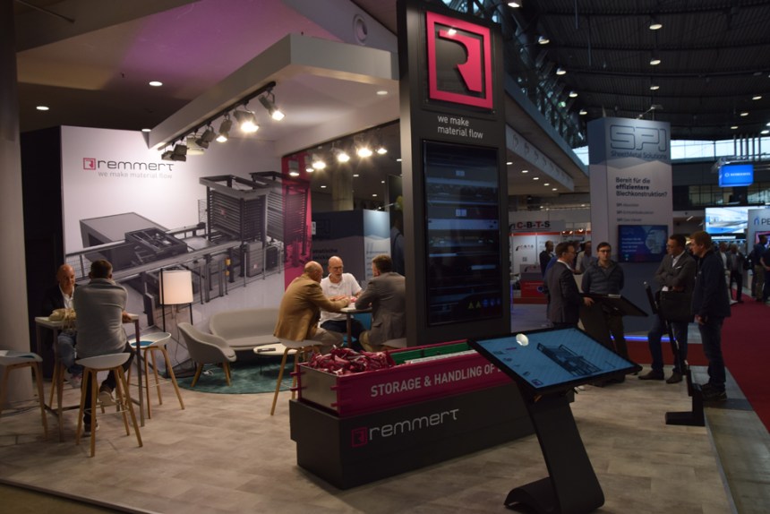 Remmert esitteli messuilla varastointijärjestelmiään ja mm. LaserFLEX -laserautomaatioratkaisuista oli tietoa tarjolla. Neljä laserleikkauskonetta voidaan sen myötä automatisoida keskitetyn linjan kautta ja linjaan voidaan integroida mikä tahansa laserleikkauskone valmistajasta riippumatta.