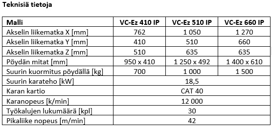 Vakiovarusteiden monipuolisuus on VC-Ez-malleissa hyvä. Koneiden pakettihintaan sisältyy muun muassa nopea 30-paikkainen työkalumakasiini, 15 barin korkeapainejäähdytys työkalun läpi, ilmapuhallus työkappaleelle ja työkalun automaattinen pituusmittaus ja rikkotarkastus.