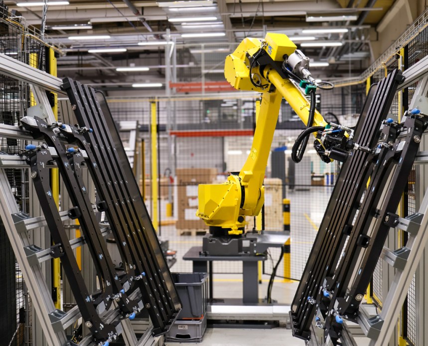 Joustavuutta ja turvallisuutta: ratkaisun toisessa päässä robotti asentaa niittimuttereita takakarmeihin samalla kun toisesta päästä puretaan valmiit etukarmien profiilit.