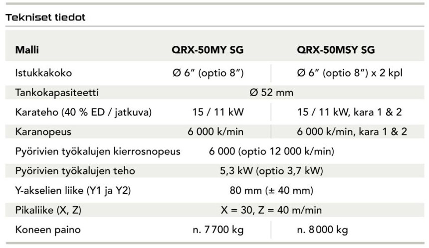 Ensimmäisinä uudesta mallisarjasta on lanseerattu mallit QRX-50MY SG (ohjelmoitava kärkipylkkä ja automaattinen tukilaakeri) ja QRX-50MSY SG (2 sorvauskaraa). Istukkakoot ovat 6” tai 8” tai niiden vaihtoehtoina holkki-istukat varsinkin tankotyössä.