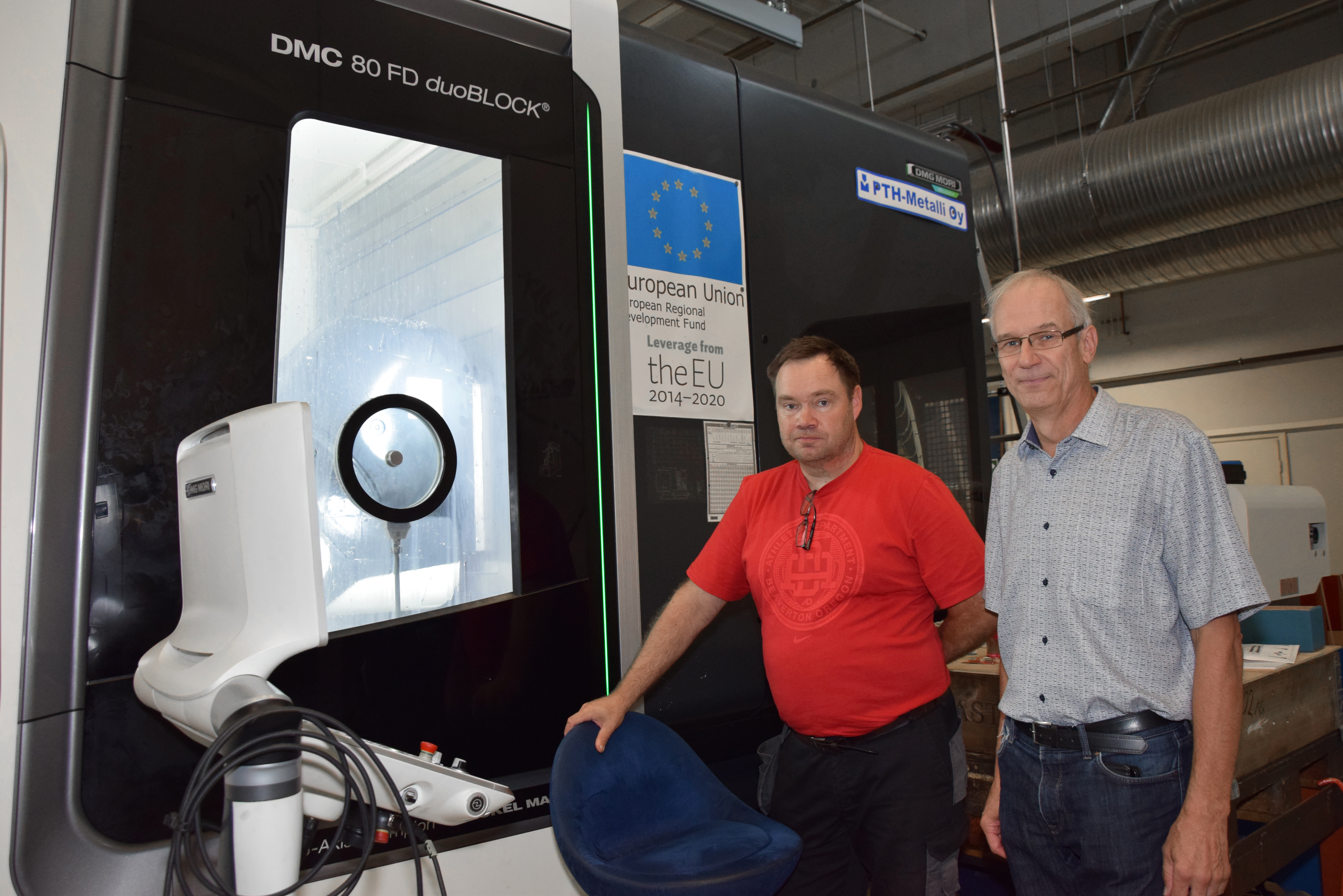 DMG Mori DMC 80 FD doBLOCK-koneistuskeskus palettijärjestelmällä tuo uusia mahdollisuuksia PTH-Metallin tuotantoon, toteavat Ari-Pekka Hänninen (kuvassa oikealla) ja tuotantopäällikkö Christian Westerlund.