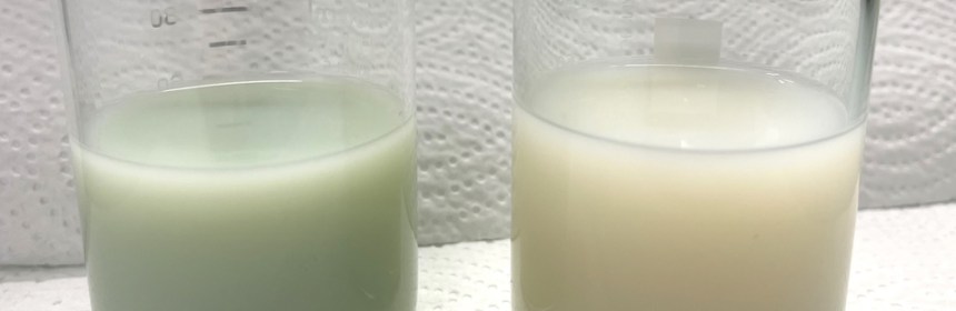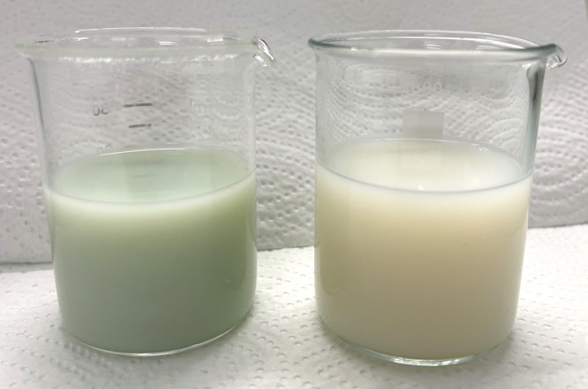 Kuparin kanssa kontaminoitunut vihertävä lastuamisneste (vasemmalla) verrokkina sama lastuamisneste ennen reagoimista kuparin kanssa (oikealla).