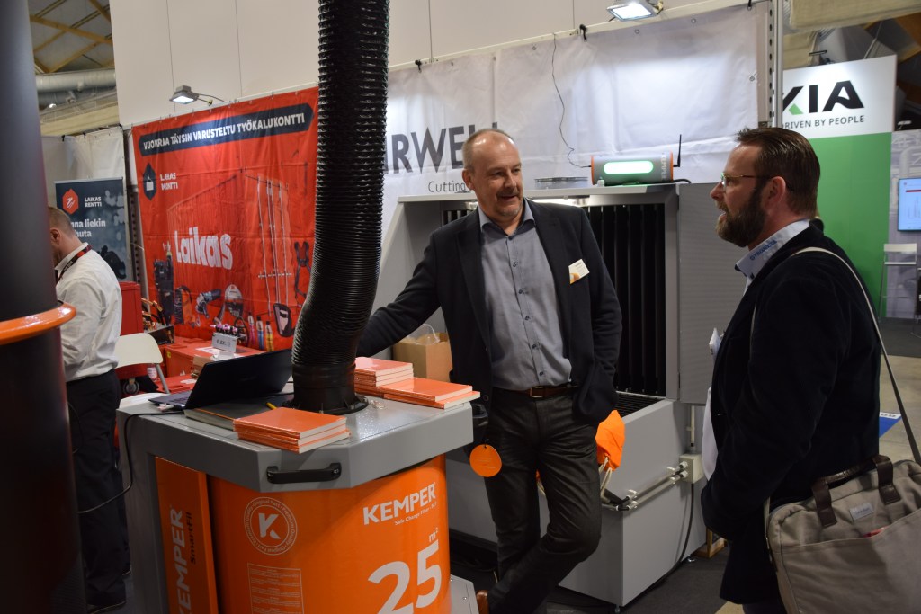 Kemper tekee laitteita mm. hitsauksen käryn ja savunpoistoon ja niitähän Suomessa myy Airwell. Antti Palomäen ohella osastolla oli mukana mm. mobiili SmartFill-savunsuodatusjärjestelmä. Osastolla poikkesi Tuomas Marjamaa Projectalta.