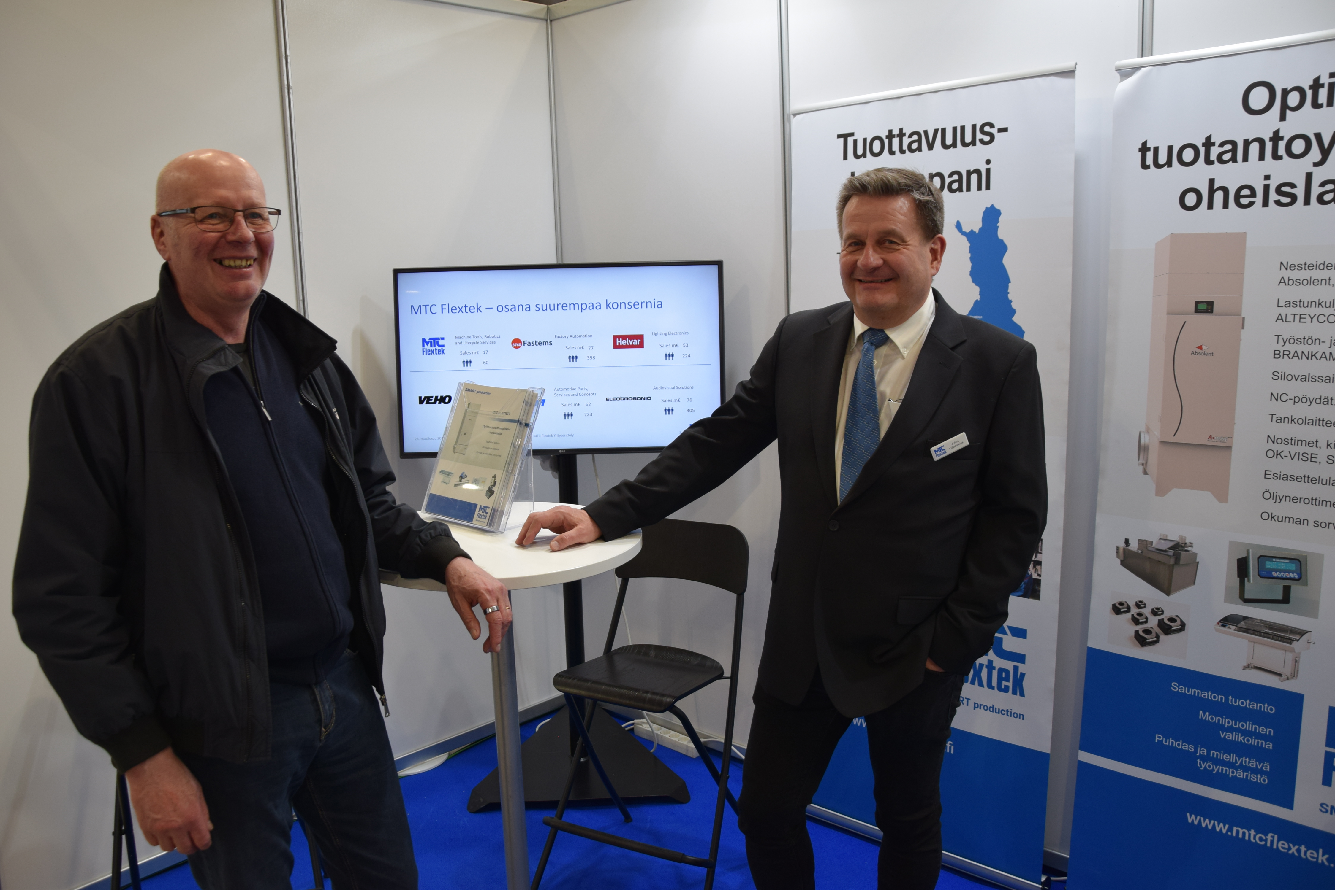 MTC Flextek oli lajissaan varsin harvinainen tapaus eli metallin konetalo näillä messuilla, konepajoja oli mukana toki useampia. Osastoa hoiti Jukka Yläpoikelus (oikealla) ja oheislaitteet olivat keskeisenä teemana. Pasi Karvonen hoitaa MTC Flextekillä pohjoisen aluemyynnin asioita.