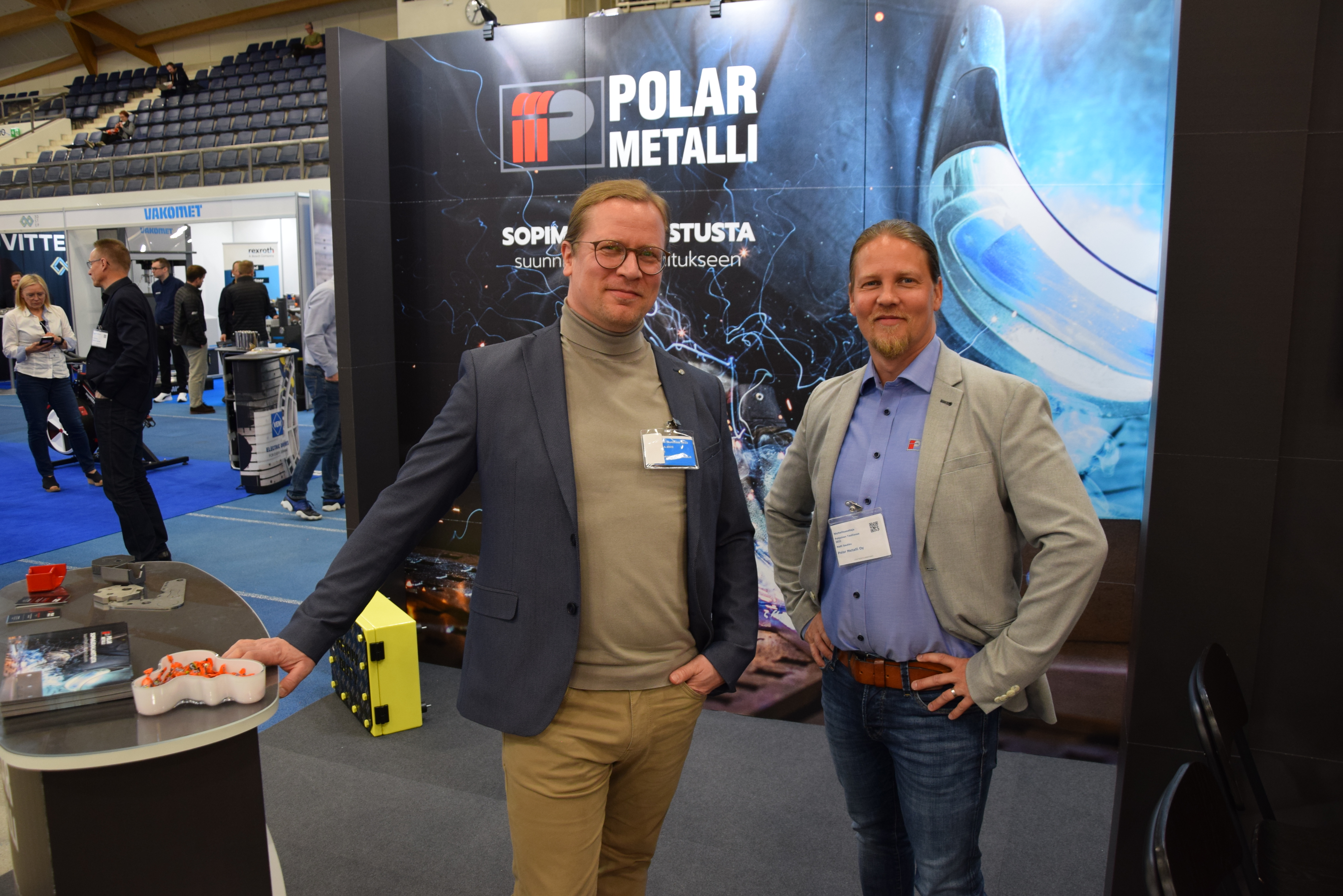 Polar Metalli kuului messujen konepajakaartiin jo useamman messukerran kokemuksella. Polar Metalli on ohutlevytuotteiden sopimusvalmistaja ja perheyrityksen omia tuttuja tuotteita ovat savupellit ja grillit. Matti Saukko (vasemmalla) ja Markus Saukko olivat esittelytöissä osastolla.