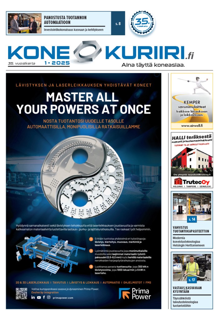 Mainiota lokakuuta! Konekuriirin numero 8/2025 on ilmestynyt. Kuten asiaan kuuluu, lokakuun numero on täynnä ajankohtaisasiaa, uutisia, mielenkiintoisia investointiartikkeleja ja tietty asiaa alkusyksyn messuilta Hannoverin EMO 2025:ta ja Alihankinnasta. Stuttgartin Blechexpo on pian, ennakkoja mukana tässä numerossa. Kannattaa lukea!