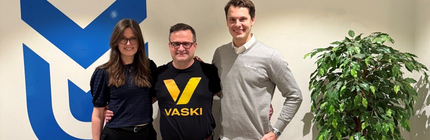 Kuvateksti: Vaski Group laajentaa toimintaansa ostamalla Ursviken Technology AB:n. Kuvassa vasemmalta oikealle Malin Arnrud (Ursviken), Michael Mansour (Vaski), Nicklas Jakobsson (Ursviken).