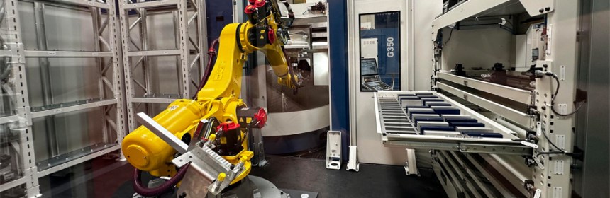 Kuva ylhäällä: GROB GRC-robottisolussa kappaleiden aihioita ja nyt myös 0-pistekiinnittimiä ladataan ja valmiita puretaan joko vetolaatikosta tai palettien latausasemasta. Vetolaatikon tasolla voi olla useita erilaisia kappaleita. Kaikkia ohjataan GROBin itse kehittämästä helppokäyttöisestä ja intuitiivisesta soluohjauksesta.