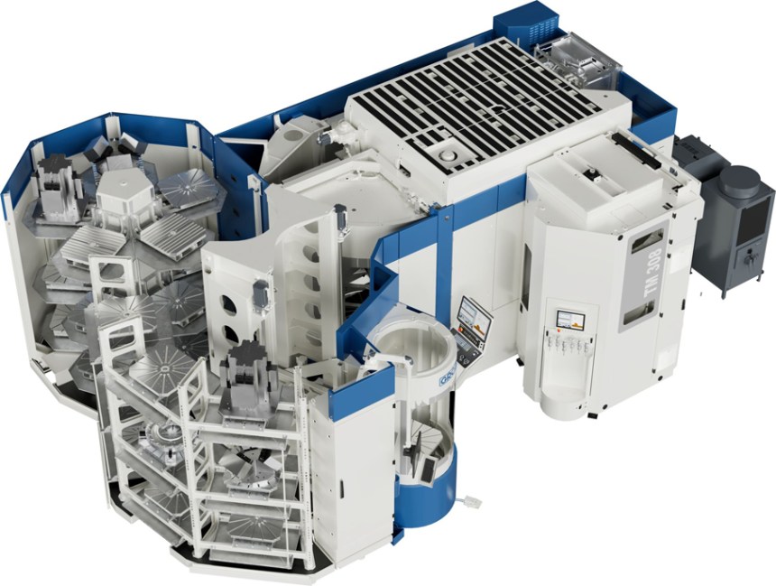 GROB esitteli myös päivitetyn version PSS-R900 pyöreästä palettivarastosta, johon mahtuu nyt peräti 32 palettia kahteen torniin. Tämä voidaan yhdistää myös kahden GROB G552 vaakakaraisen 5-akselikoneen väliin.