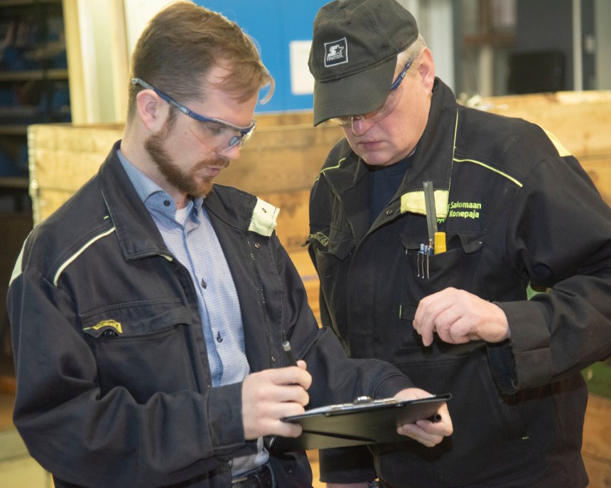 ”Meidän valmistuksemme prosessi oli niin samantyyppinen, mutta asiakkaat olivat eri, vanhan Pentin Paja Oy:n kanssa. Yhteinen tahto se lopulta oli, mikä sai yrityskaupat liikkeelle ja se, että kaikki tunsivat jo entuudestaan toisensa”, Pentin Paja Oy:n uusi toimitusjohtaja Seppo Tanninen pohtii historiaa. ”Toisaalta meillä voidaan tehdä enemmän yhteistyötä myös markkinoinnissa.”, Seppo jatkaa. Vasemmalla Janne Häikiö.