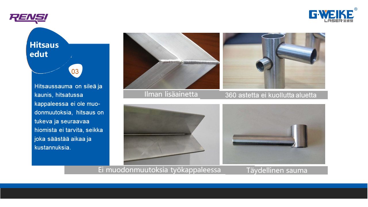 Kuitulaserhitsauksen etuna on myös yksinkertainen käyttö, kaunis hitsisauma, suuri hitsausnopeus eikä lisäaineita tarvita. Sillä voidaan hitsata metallimateriaaleihin, kuten ohut ruostumaton teräslevy, teräslevy ja sinkitty levy, ja se korvaa täydellisesti perinteisen argonhitsauksen, kaarihitsauksen, sähköhitsauksen ja muut prosessit.