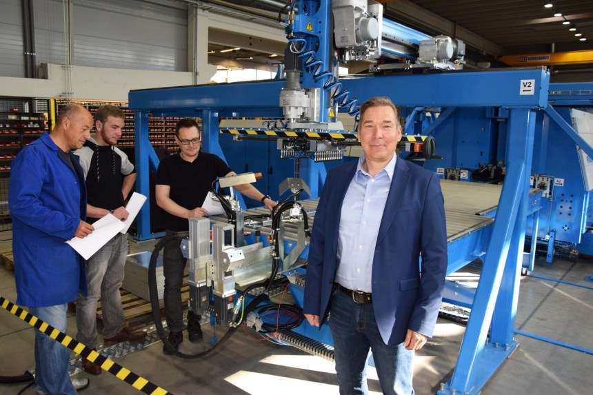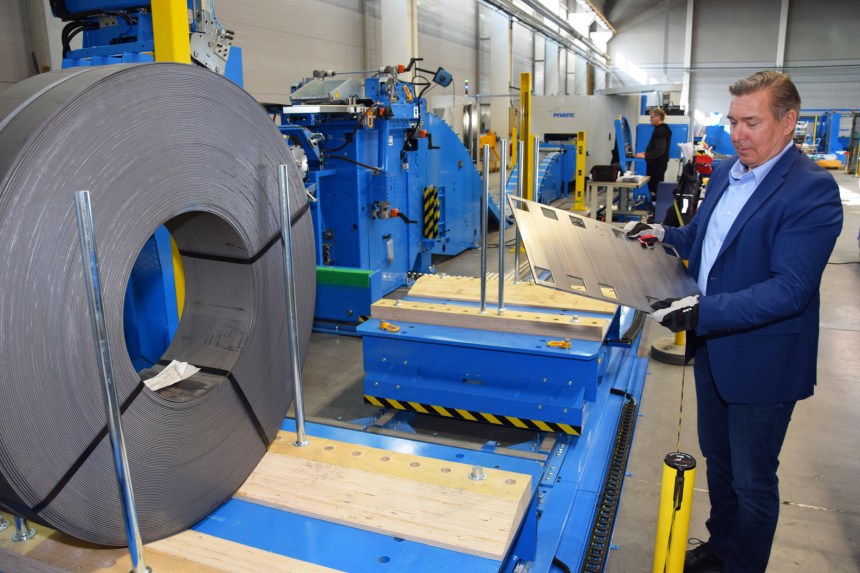 ”Yksi tyypillinen esimerkki viimeisimmistä toimituksistamme on linjakokonaisuus, minkä muodostavat korkeavarasto, arkkilävistyskone, leikkauskone hoitamassa arkkien pituus- ja leveyssuunnan leikkauksen sekä loppupäässä taivutusautomaatti ja särmäyspuristin, joiden yhteydessä toimii kaksi robottia.”