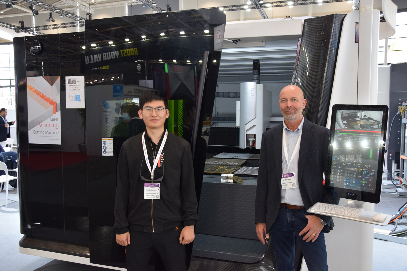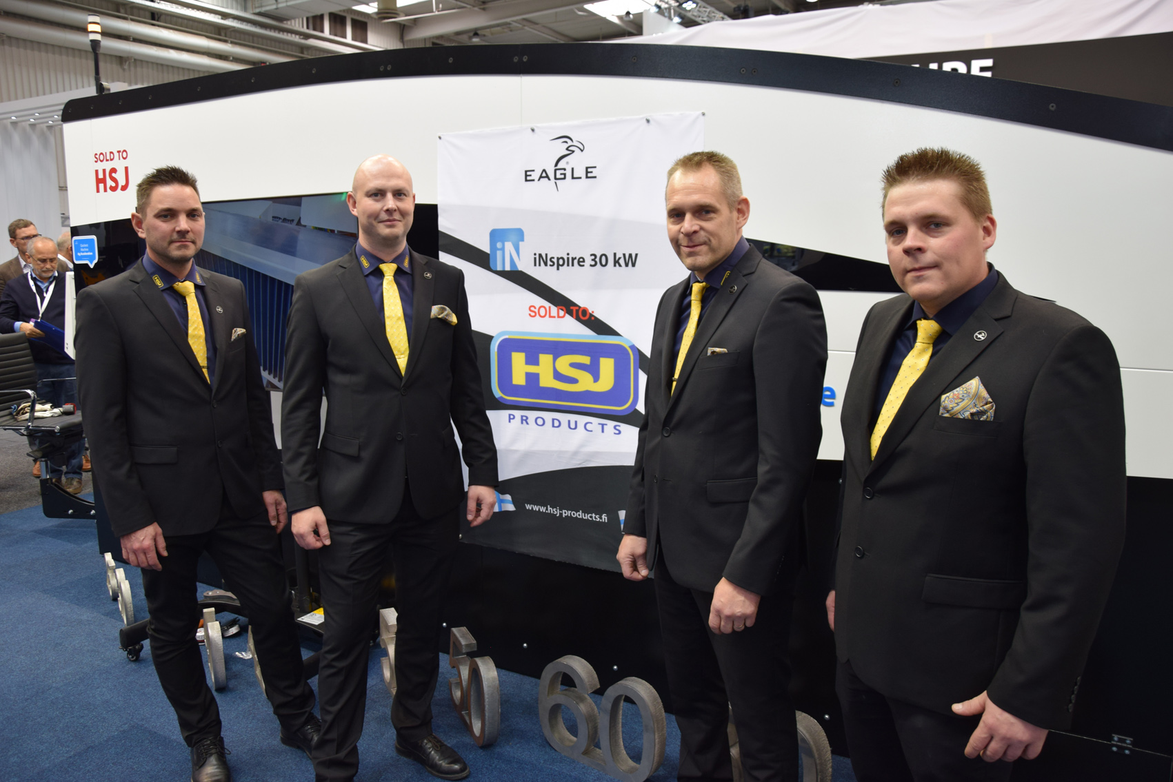 Nykypäivän tuotannossa automaatio on iso tuottavuuden tekijä: Euromacin lähestymiskulmaa asiaan edustaa mm. taivutussolu FX bend Cell, missä toimivat sähköservotoiminen särmäyspuristin ja Kukan robotti. Suomessa Euromacit myy Maanterä, miehet kuvassa Euromacin Andrea Lenzotti vasemmalla, Maanterän Tero Kaivonen ja Euromacin Andrea Fontaini.Mazak esitteli messuilla uutuuksia NEO-sarjaan, Optiplex 3015 NEO tasoleikkauskone sekä FG NEO 400 putkikuitulaser 3D-päällä ja nLIGHT-resonaattorilla varustettuna olivat esillä. nLIGHT-teknologia on valikoimassa uutuus IPG:n rinnalla. Kuvan FG NEO 400:llä voidaan leikata halkaisijaltaan 400 mm:n putkea tai profiilia, putkiaihioiden pituudet aina 15 metriin saakka.Prima Power oli messuilla mukana tuttuun tapaan kookkaalla osastolla ja isot automaatiojärjestelmät olivat osaston ytimessä. Kaksi linjaa oli toiminnassa, oikealla Laser Genius+combo Toweer Laser-varastojärjestelmä, taaempana PSBB-linja, minkä yhteydessä esiteltiin samalla uutta Shear Brilliance -lävistys- ja leikkausjärjestelmää sekä myös uusinta EBE-taivutusautomaattia. Taso- ja putkikuitulaserien sekä yhdistelmien valmistaja Bodor esitteli EuroBLECHissä esimerkiksi uutta 22 kW:n teholuokkaa sekä valmistajan Bodor Genius laserleikkuupäähän kehitettyä säteen Scanning Cutting -kuviointiominaisuutta. Oikealla FMS Servicen Kari Riihimäki, vasemmalla tuttu Suomenkin kävijä Bodorin Nordic Europen Service Manager Kelvin. Globaali ensiesittely: Amadan täyssähköinen kolmimetrinen särmäyspuristinuutuus EGB 1303 ATCe. Mukana kolme takavastetta, uusi AMNC 4ie-ohjaus ääniohjauksella ja iso ATC-työkaluvarasto. Myös pienempi EGB 6013 ARce-robottisolu lanseerattiin. Kuitulasereista esillä olivat mm. 6 kW:n Ventis ja 12 kW.n Regius AJe, joka voitti messujen MM leikkuutekniikka -palkinnon. Sveitsiläisvalmistaja Bystronic esitteli messuilla uutuuksia niin laserleikkaukseen särmäykseen kuin mm. varastojärjestelmiinkin, ohjelmointipuolen uutuus on BySuite-paketti. ByCut Stariin esiteltiin messuilla 30 kW:n teholuokka. Koneen edessä Ville Virta, hän aloitti Bystronic Scandinavian Suomen myynnissä Jari Enontekiön kumppanina tämän vuoden alussa. Messerin osastolla otettiin kuvayhteyksiä tehtaalle, uusia digitalisointimahdollisuuksia esiteltiin ja Element 400-laserleikkauskone ja Element 400 -viisteplasma olivat koneista tarkastelussa. Maahantuoja meillä on Aliko, kuvassa oikealta Alikon tj Stanislav Demin, Messerin CEO/Europe Jörg Mosser ja Alikon myyntipäällikkö Timo Valtanen. Trumpfin kookas osasto kuuluu monilla kävijöillä EuroBLECH-tapahtumien tuttuihin kiintopisteisiin. Mallistoa oli esillä koko tuotantoketjuun. Esimerkiksi 2D-tasolaser TruLaser 5030 fiber esiteltiin 24 kW:n tehoin, 3D-laserleikkaukseen puolestaan kookas Trulaser Cell 8030. Kuvan TruBend Cell on uusi ratkaisu automatisoituun taivutukseen. Juhlatunnelmaa: Eaglen osastolla esittelyssä ollut Eagle iNspire 30 kW leikkaa jatkossa Suomessa Pedersöressä HSJ Productsilla ja talon väkeä oli messureissulla Hannoverissa porukalla juhlan kunniaksi. HSJ Productsin miehet oman Eaglen edessä vasemmalta Sebastian Forsbacka, Jörgen Häggman, Roger Edström ja Sören Häggman.