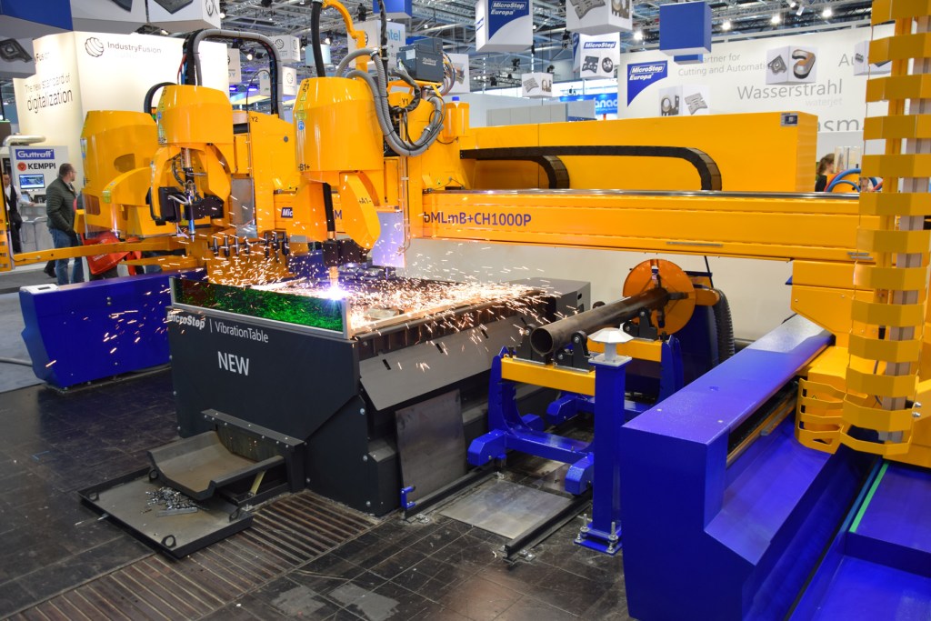 Microstepiltä oli messuilla kookas paletti koneita ja ohjelmistoratkaisuja. Kuvassa lippulaivamallistoa, leikkaus- ja porauskeskus MG, millä esiteltiin viisteleikkausta plasmalla, viistepolttoleikkausta, lasermerkintää, porausta, kierteitystä sekä putkien ja neliömäisten putkien plasmaviisteleikkausta. Mukana oli myös uusi alaimupöytä materiaalipoistoon.