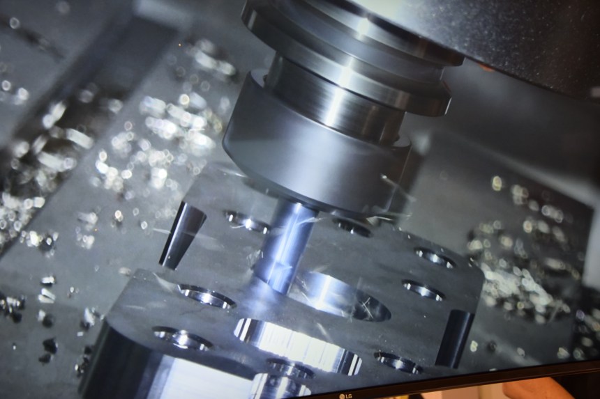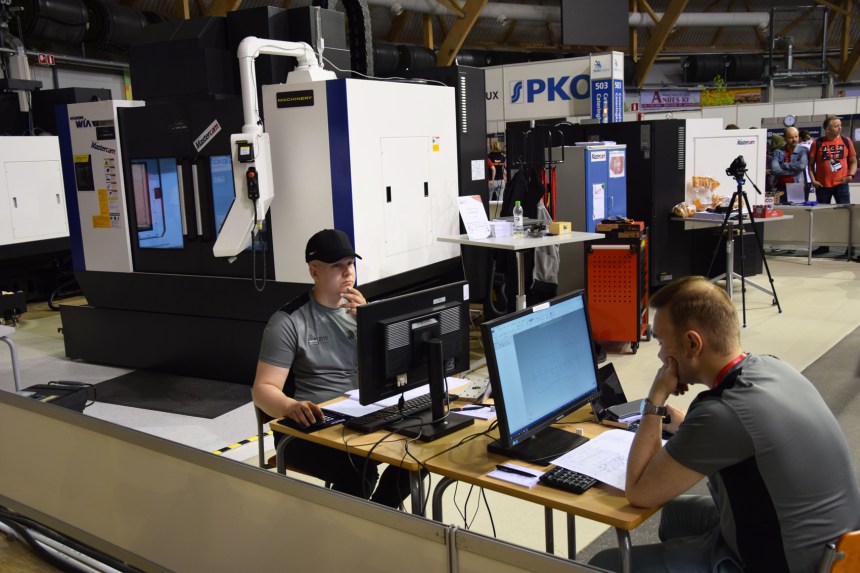 CNC-koneistuksen kilpailutehtävät tehtiin Hyundai-Kian konein, kahdella koneistuskeskuksessa ja kahdella sorvilla. Etualalla finalistit Joona Savolainen (oikealla) ja Miika Korhonen, CNC-koneistuksen kulta- ja hopeamitalit.